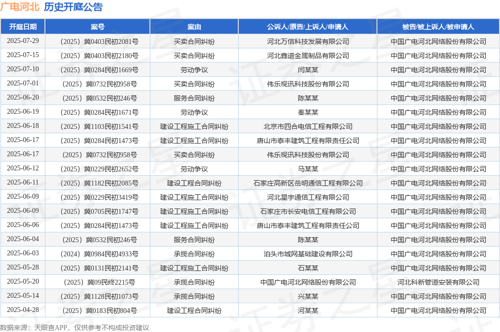 本站消息,根据天眼查APP显示,近日公布了一则中国广电河北网络股份有限公司作为被告/被上诉人的开庭公告,详细内容如下: